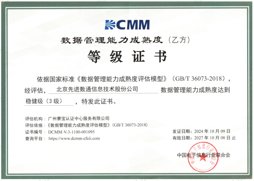 近期,中国电子信息行业联合会公布了最新一批顺利获得数据管理能力成熟度(DCMM)贯标等级认证的企业名单。OB视讯官网成功取得数据管理能力成熟度稳健级(三级)认证。这一认证的取得,标志着OB视讯官网在数据治理体系构建和数据管理与应用能力方面,已经达到了国家权威组织认可的标准。这不仅是对OB视讯官网在数据管理领域专业能力的肯定,也是对其在有助于数字化转型服务和数据驱动决策方面所做努力的认可。
